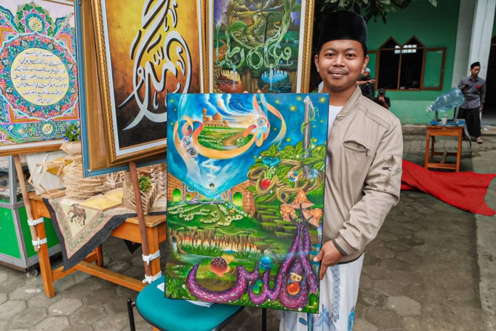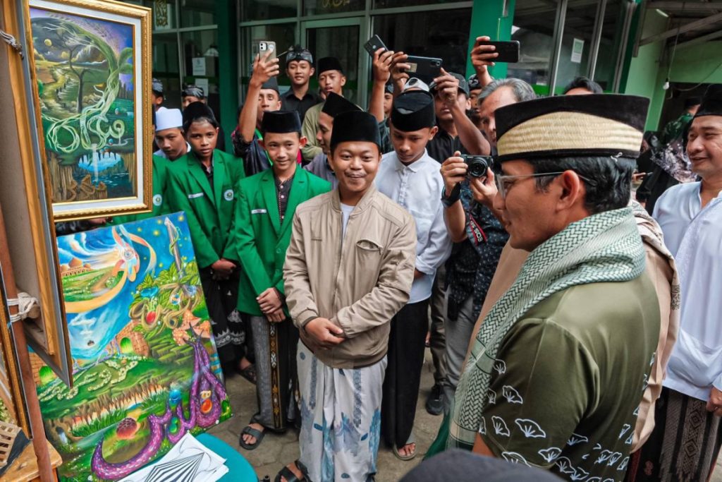 Menparekraf Sandiaga juga menyempatkan membeli karya seni kaligrafi hasil kreasi santri, sebagai bentuk dukungan terhadap produk kreatif pesantren.