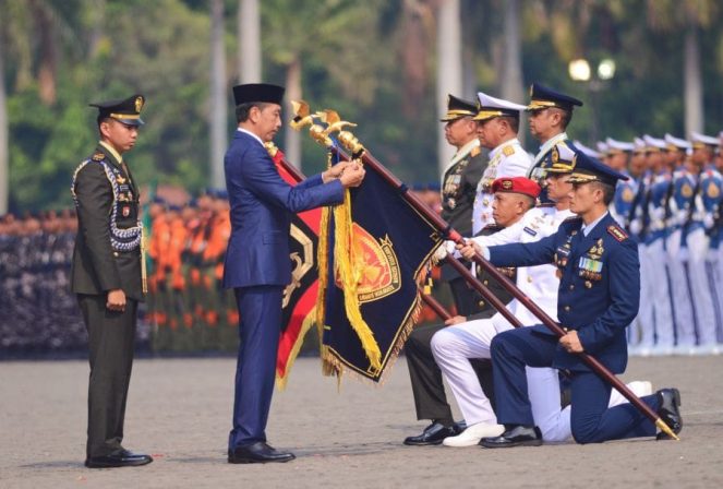 Sportstourismindonesia – Jakarta – 5 Oktober 2024, Presiden Joko Widodo (Jokowi) didampingi Panglima TNI Jenderal TNI Agus Subianto Tan memimpin upacara peringatan Hari Ulang Tahun (HUT) Tentara Nasional Indonesia (TNI) ke-79 yang berlangsung megah di Lapangan Silang Monumen Nasional (Monas), Jakarta, Sabtu (5/10/2024). Upacara kali ini menampilkan salah satu peringatan terbesar dalam sejarah HUT TNI, dengan partisipasi 30.206 personel, 521 Alat Utama Sistem Persenjataan (Alutsista), dan 145 unit kendaraan klasik serta motor gede (moge).