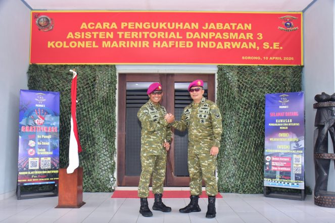 Sportstourismindonesia – Sorong April 2026 Dispen Kormar TNI Angkatan Laut (Sorong). Komandan Pasmar 3 Mayjen TNI (Mar) Andi Rahmat M., secara resmi mengukuhkan jabatan Asisten Teritorial (Aster) Danpasmar 3 dalam sebuah upacara yang berlangsung khidmat di Lobby Mako Pasmar 3, Kesatrian Marinir Agoes Soebekti, Jl. Sorong–Klamono Km.16, Distrik Klaurung, Kota Sorong, Papua Barat Daya, Jumat (10/04/2026).
